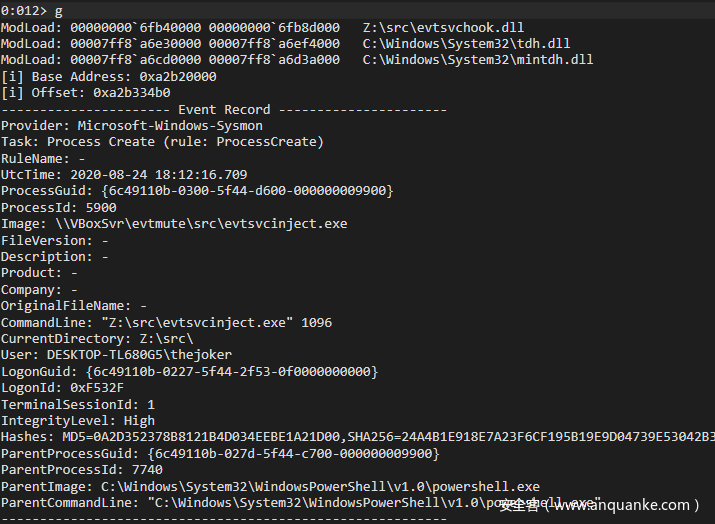 当注入钩子时,SharpEvtMute.exe会调用CreateRemoteThread,这个调用是在钩子被放置之前进行的,所以它会被Sysmon报告。这是因为SharpEvtMute.exe的注入特性只能作为PoC来使用。如果不想被记录,我建议手动将EvtMuteHook.dll注入到事件日志记录服务中。