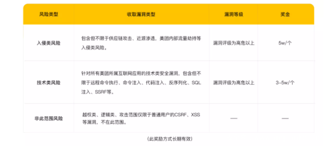 3、指定类型漏洞奖励:即日起提交指定类型的有效漏洞,漏洞将按照如下表格进行奖励:
