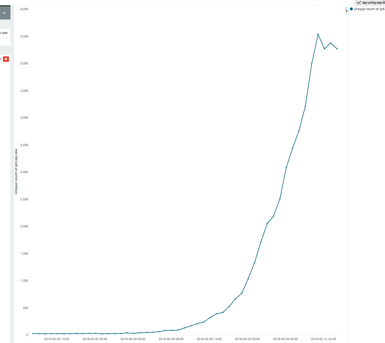 - 传播时间:最早的感染时间可以回溯到 1月31日附近。当前这波蠕虫式感染从 2018-02-03 下午 15:00 附近开始被我们的系统检测到,目前仍在持续增长。