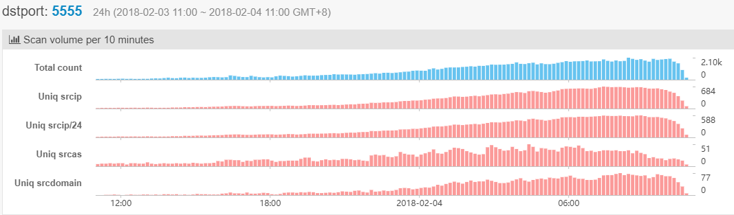 从 2018-02-03 晚间开始,我们检测到端口 5555 上的扫描流量正在快速增长,如下: