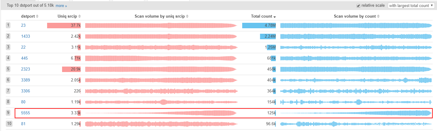 如下图所示,当前 5555 端口扫描流量已经排入所有端口的前十。上一次我们看到一个全新端口排入前十,是2016年9月期间,mirai僵尸网络开始组建其僵尸网络。