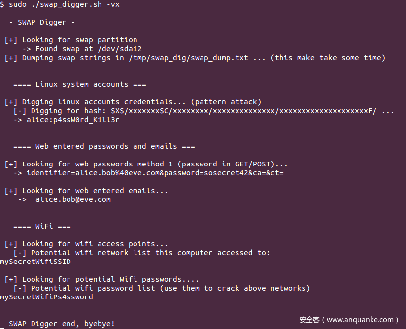 swap_digger主要功能是够自动挖掘并提取出Linux 交换区中的包括用户证书、Web表单证书、Web表单电子邮件、基于http的身份验证、Wifi SSID和密钥等在内的敏感数据。