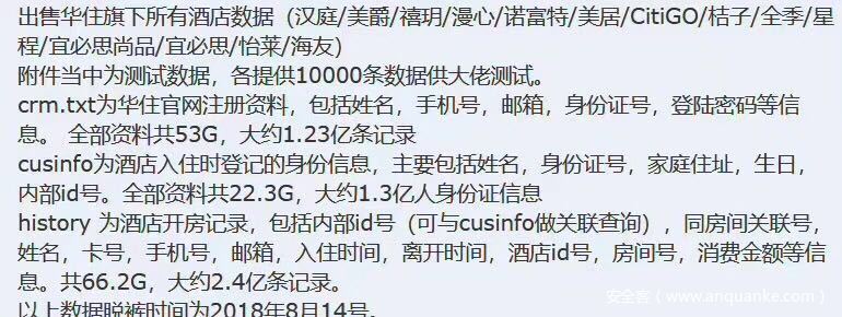 在今天上午的时候,一颗重磅炸弹在暗网中文论坛引爆。发帖人在帖子中出售华住旗下所有酒店的重要数据,包括其用户的姓名、手机号、身份证号、密码等敏感信息,数量达到了1.23亿条之多。可是还远远不止如此,除了用户的个人信息,还有近1.3亿条入住登记信息和2.4亿条开房数据。三个数据库(crm、cusinfo、history)总大小已经接近141.5GB。