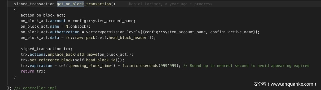 以上是构造 onblock 操作的一些定义,可以看到,onblock 操作的 data 字段为 header_block_header,就是当前的区块头信息,即相对于当前 pending 区块上一个块的区块信息,接下来我们追踪该函数的调用过程。