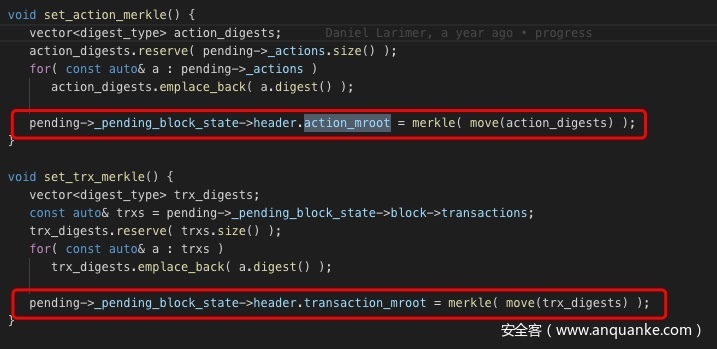 到了这里,我们可以清楚的看到,除了 action_mroot 和 transaction_mroot 外,所有的其他变量都是可以轻松获取的,然后我们继续深入看下 transaction_mroot 和 action_mroot 的计算方法。