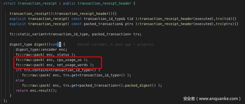 以上两条分别是 transaction digest 和 action digest 的生成方式,我们可以看到,transsaction digest 的计算使用到了 cpu 和 net 作为因子,这两个因子取决于交易执行时 bp 的节点状态,虽然透明但较难准确预测,而 action digest 没有使用到这两个变量,可以轻松的算出来。那么分析到这里,我们可以确定的是,要预测一个区块的哈希,需要引入不确定的 cpu 和 net 的使用量,那么,有没有办法不将这两个因子引入到计算当中呢?