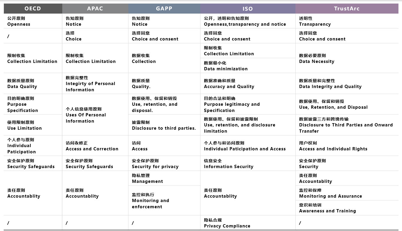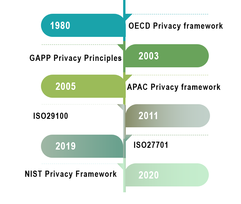TrustArc企业隐私和数据治理合规评估框架参照了相关组织的个人信息保护框架的内容, 比如OECD、APAC、GAPP、ISO、NIST等组织发布的隐私框架, 所以在正式介绍TrustArc隐私企业隐私和数据治理合规框架之前,对几大组织提出的隐私框架,从发布时间、隐私原则等内容进行基本的介绍。