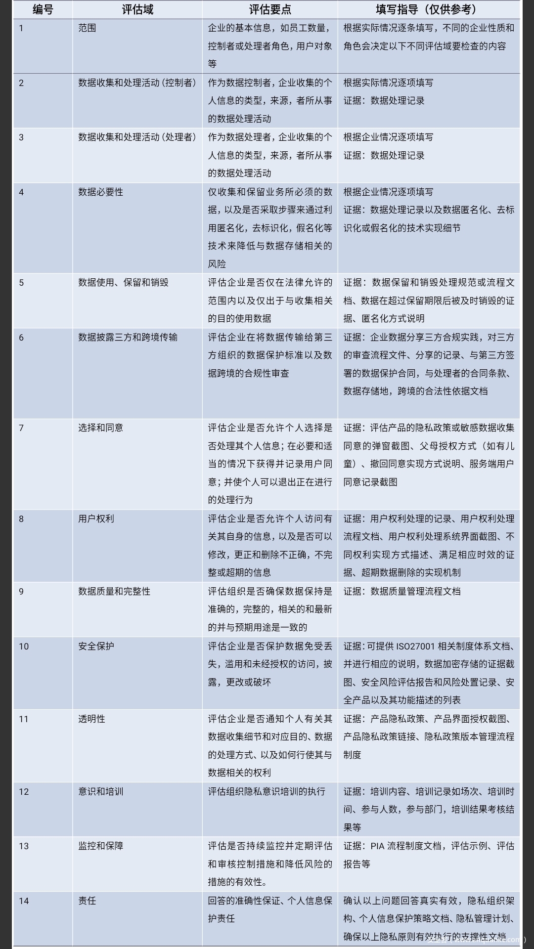 合规评估问卷的框架都来自于TrustArc隐私和数据治理框架,涵盖了从数据处理活动,到框架中的隐私原则、企业隐私管理计划持续化和监控、以及企业相关隐私管理责任的方方面面。问卷各个部分的填写指导以及准备的证据信息可以参照下表:
