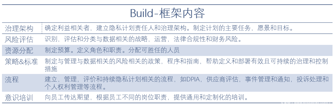 构建阶段中的评估标准主要是为了与法律法规以及有效的实践和合规计划保持一致,建立,维护并不断发展和完善与其他信息治理,合规性和风险管理相符的隐私管理程序。