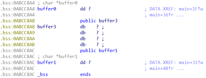 实际上,可以看到在两次调用之后,根据mov ds:buffer0, eax和mov ds:buffer1, eax得知开辟后的缓冲区被复制到标识为buffer0和buffer1的两个存储区中