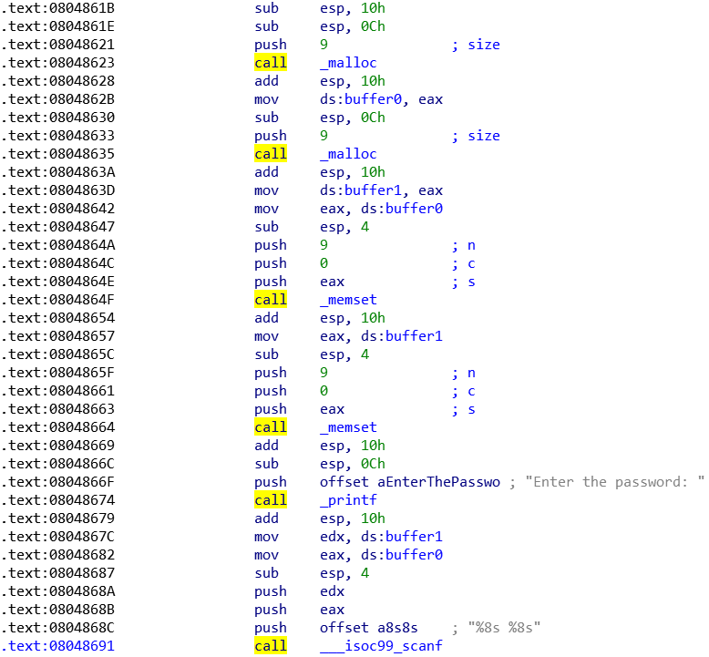 我们可以看到malloc()分配了两个缓冲区,因为maclloc()函数只有一个参数,通过push 9不难推测出两个缓冲区大小为9字节(IDA也能直接看到的说),并返回缓冲区地址到EAX寄存器中