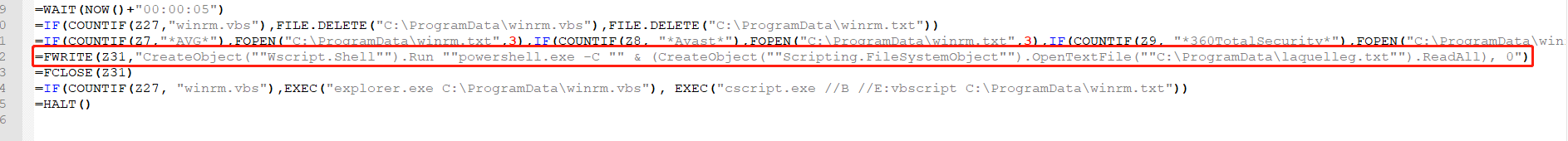 4. 宏代码执行完上述动作后延时5S,最后将自启动代码写入到“winrm.txt\ winrm.vbs”,并覆盖之前写入的脚本代码,如下图: