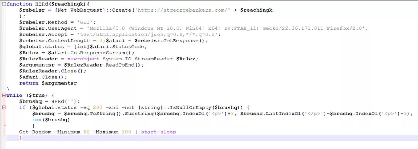 8. “laquelleg.txt”代码实现的是加载器功能,访问 URL “https://stgeorgebankers.com/”将其网页携带的 Payload 解析并执行,网页中通过“<p>Payload</p>”方式嵌入 Payload。