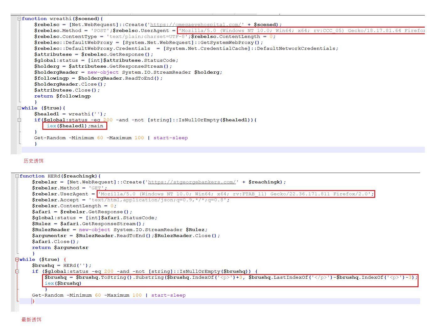 5. 释放的 PowerShell 脚本中,POST 请求头中的 UserAgent 变为更新的版本号,并且 Payload 由直接存放变成嵌入到网页中的标签之中。
