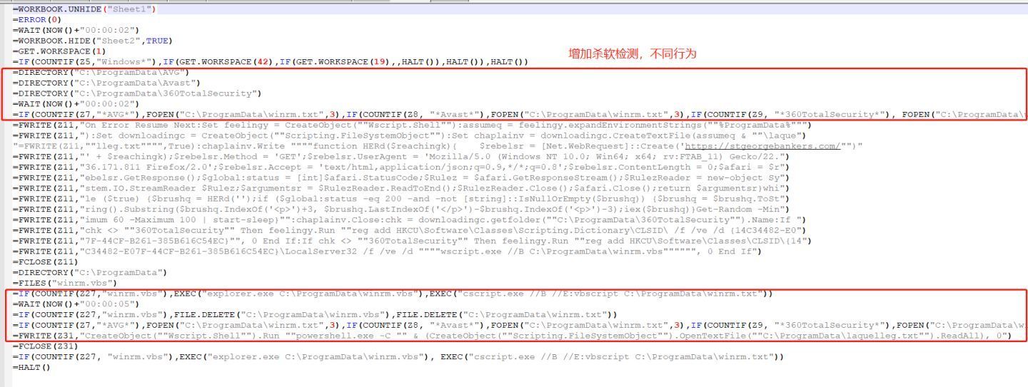 4. 该历史诱饵和最新投递的诱饵对比,新投递的诱饵宏代码中增加了杀软检测代码。