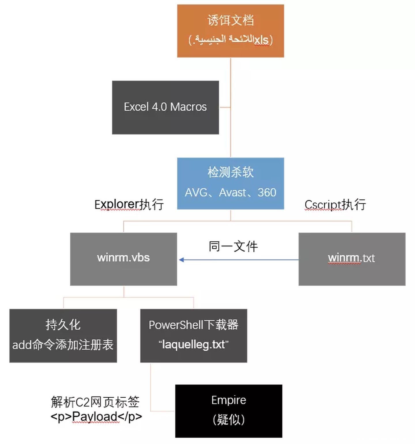 该组织通常在攻击活动中投递携带有恶意宏代码的表格文档诱饵,在目标受害者触发宏代码后广泛使用脚本语言(VBScript、PowerShell、VBA)作为攻击的一部分,最终通过 Empire 框架进行下一阶段的攻击。除此之外,该组织早期也曾投递过 VBS 类型的诱饵,加载后会释放出 DOC 文档迷惑受害者。