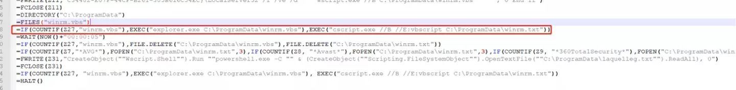 2. 宏代码检测了包括:“AVG”、“Avast”和“360TotalSecurity”三种杀软,如检测到三种杀软,则打开文件“winrm.txt”;如没有检测到,则打开文件“winrm.vbs”。两个文件写入的内容均为“VB”代码。