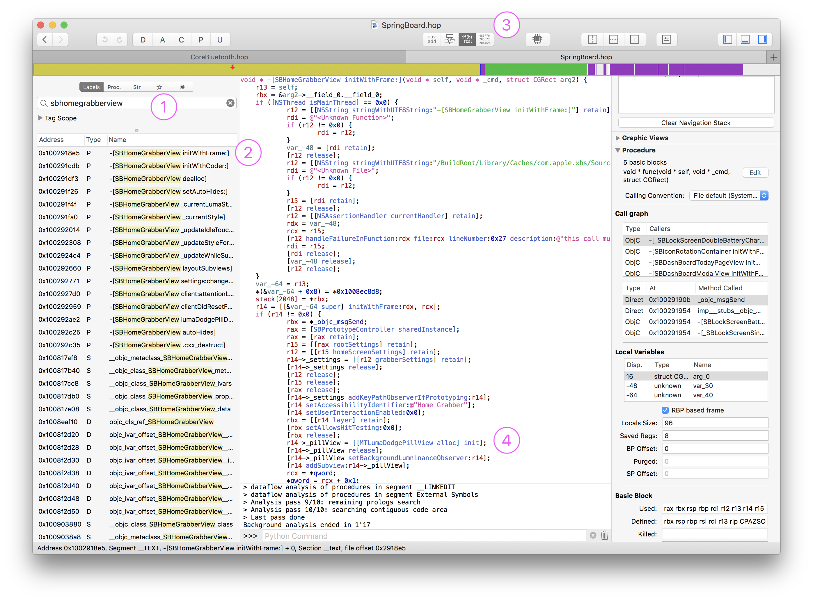 为了弄清楚应该在哪里寻找相关代码,我试着去寻找类似的UI元素。最开始我认为系统状态栏是最为接近的一种元素。与Home Indicator一样,系统状态栏也会出现在锁屏界面上,也会被添加到每一个app窗口中。因此我最开始尝试在UIKit中寻找包含与状态栏有关的一些代码。搜索GitHub上已有的UIKit头文件代码后,我并没有找到与新的Home Indicator有关的任何代码。接下来,我想探索的是SpringBoard,这是一个“app”,位于CoreServices目录中,包含与锁屏及主屏幕有关的各种系统功能。使用class-dump(安装命令为$ brew install class-dump)导出SpringBoard中包含的类后,我们可以找到一个比较有趣的东西:SBHomeGrabberView。这对我们而言是个不错的开始: