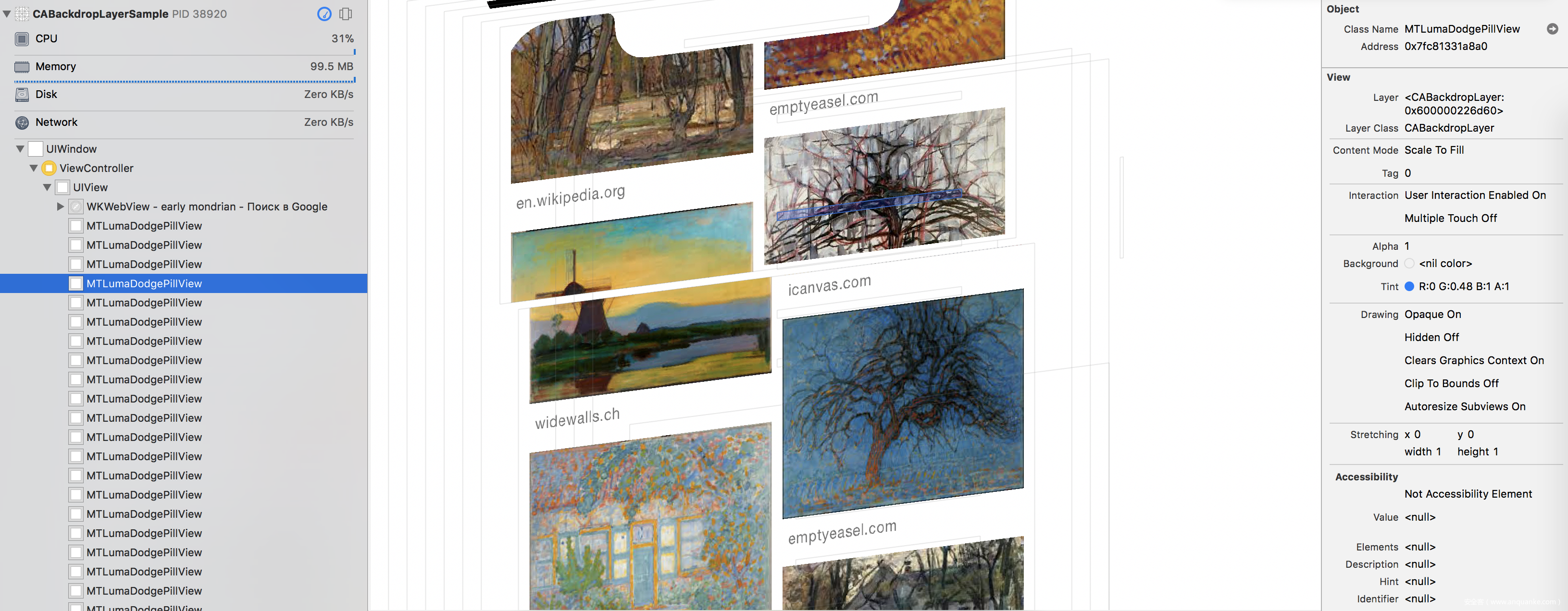 我们离目标已经越来越近,MTLumaDodgePillViewStyle本身只是有序数字的一个封装器。在内部中,它还包含许多私有类:它可以作为调用CABackdropLayer(私有类,自iOS 7以上系统引入)的代理,使用了一整套CAFilter(私有类,自iOS 2以上系统引入),其中包括名为kCAFilterHomeAffordanceBase的一个滤镜类。iOS从7开始引入了毛玻璃特效,而CABackdropLayer正是该特性背后的推动者。简而言之,它负责克隆图层后的视图层次结构,收集相关内容的统计信息。此外,任何CALayer都支持将QuartzCore过滤器应用于任何图层上。只要克隆视图的层次结构以及应用在试图上的过滤器,我们就可以产生UIVisualEffectView提供的所有变化效果。我们来看一下最基本的一种毛玻璃效果: