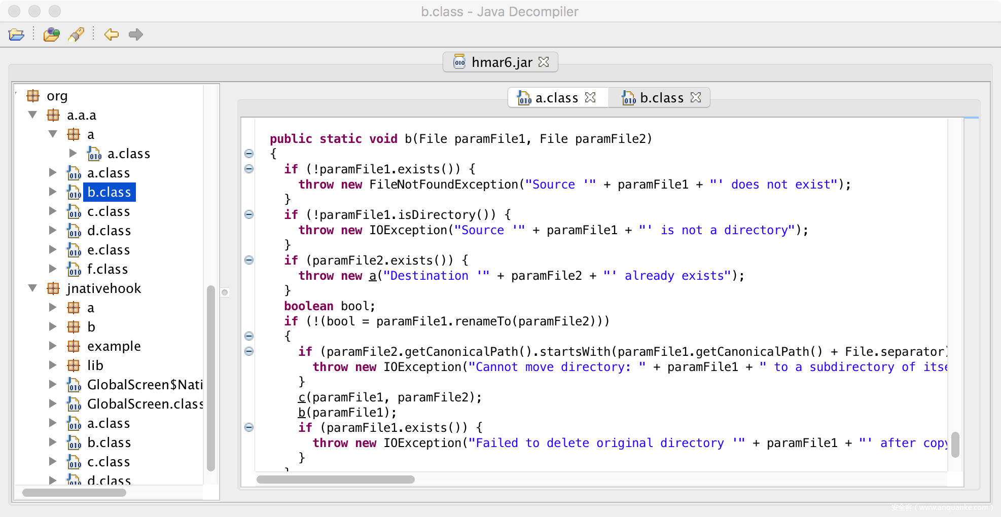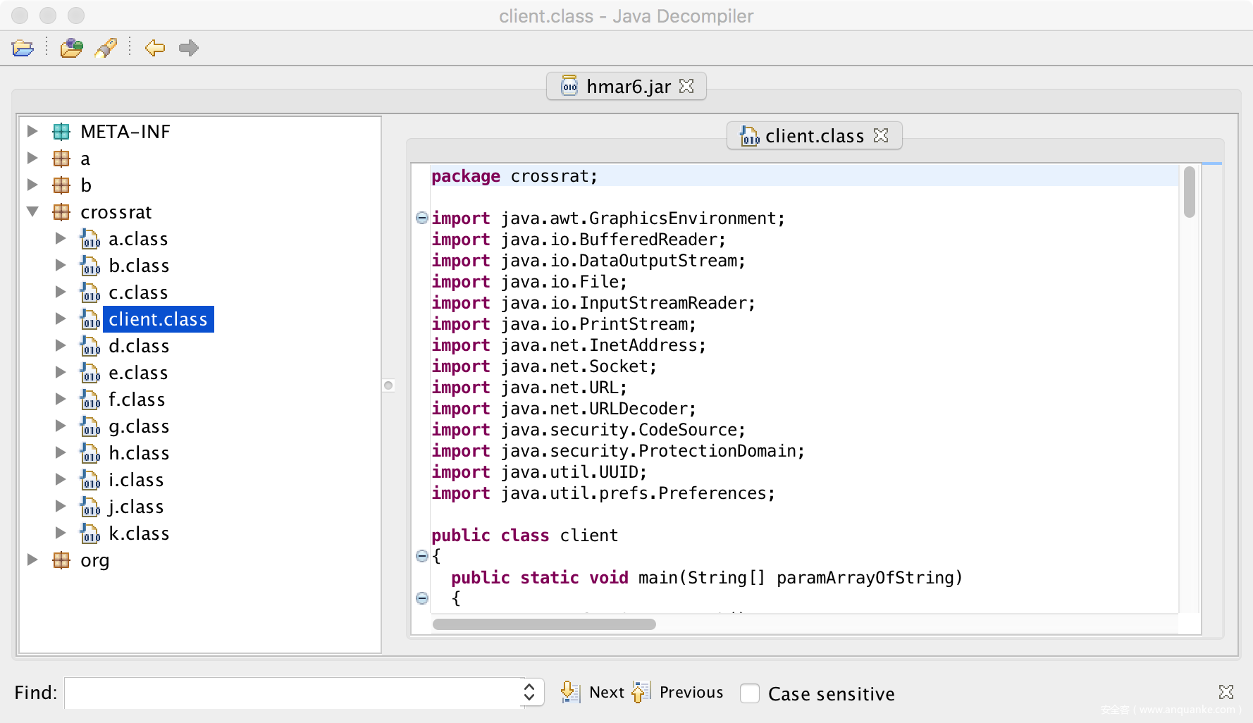 除此之外,我们还将给大家分析crossrat包中的client.class文件,因为这份文件中包含了恶意软件的主入口点()以及crossrat的主要实现逻辑。但是,我们首先来看一看jar文件中的其他数据包:‘a’, ‘b’和‘org’。