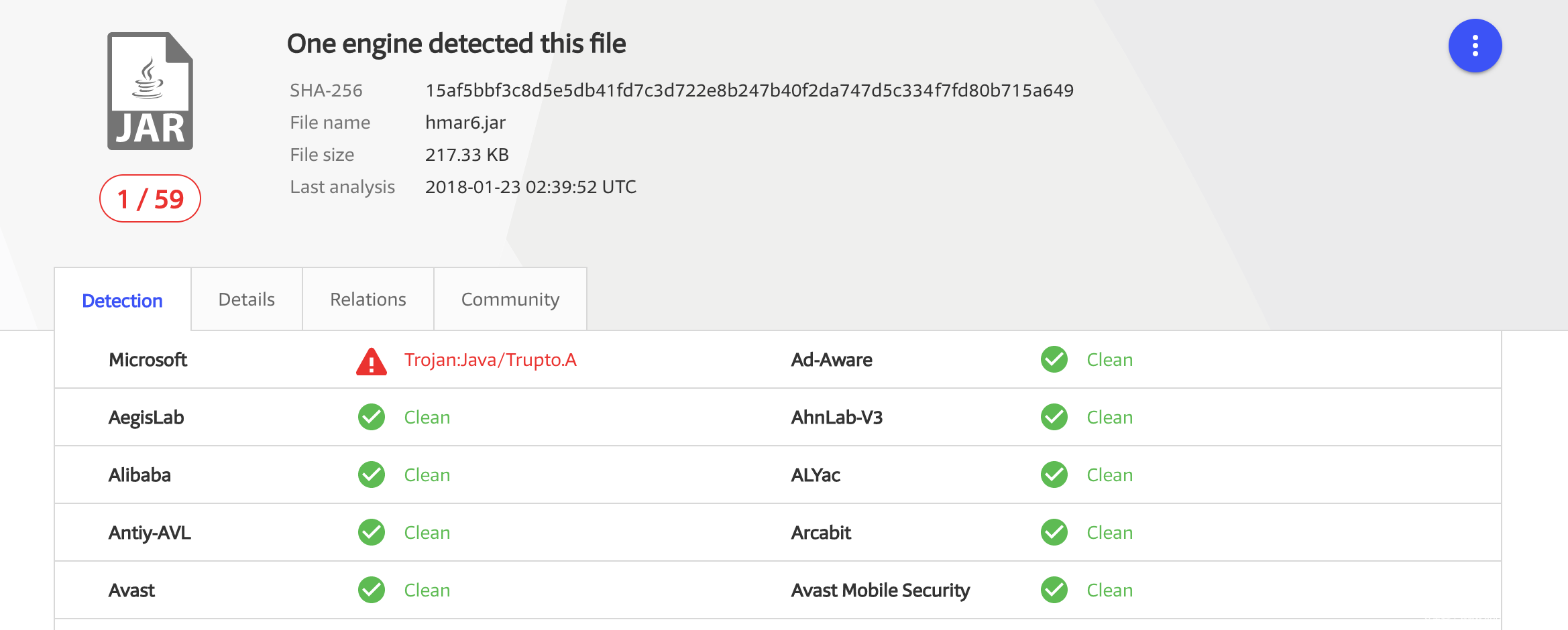 研究人员已经将一份样本(hmar6.jar)提交到了VirusTotal,点击【这里】获取。当然了,现在大多数的安全防护产品还无法检测到这种威胁。