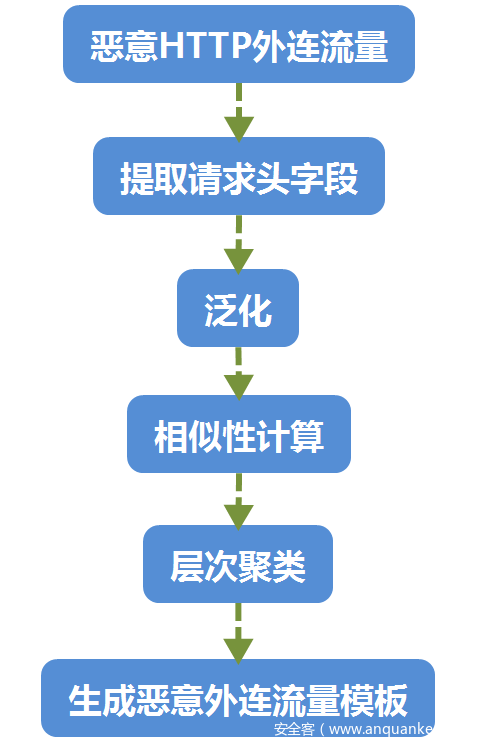 由于同一家族的恶意外连流量具有上述的相似性,因此可以使用聚类算法将同一家族的恶意流量聚为一类,提取它们的共性模板,最后利用模板检测新的恶意外连流量。