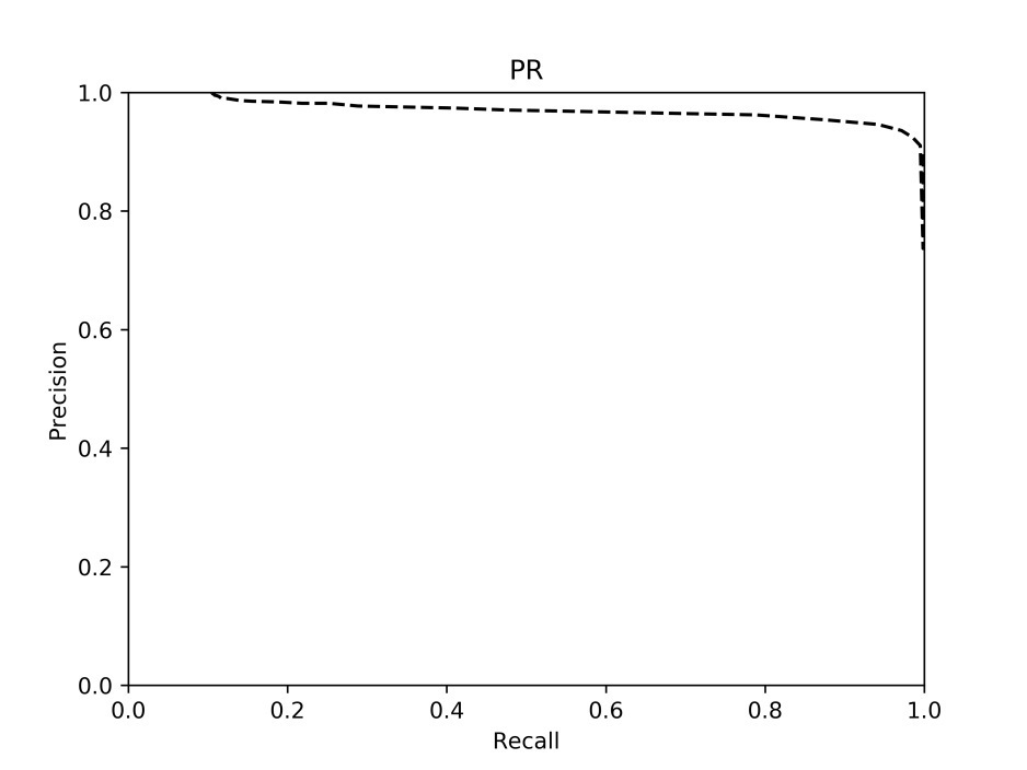 采用80%的黑样本作为训练集,20%的黑样本及全部白样本作为测试集,测试算法效果,绘制匹配阈值的PRC曲线如图5.1。可以看到随着召回率的提升,算法一直保持着较高的精度。最终选择了0.8作为匹配阈值,此时算法精度为93.56%,召回率为97.14%,F-值为0.9532。