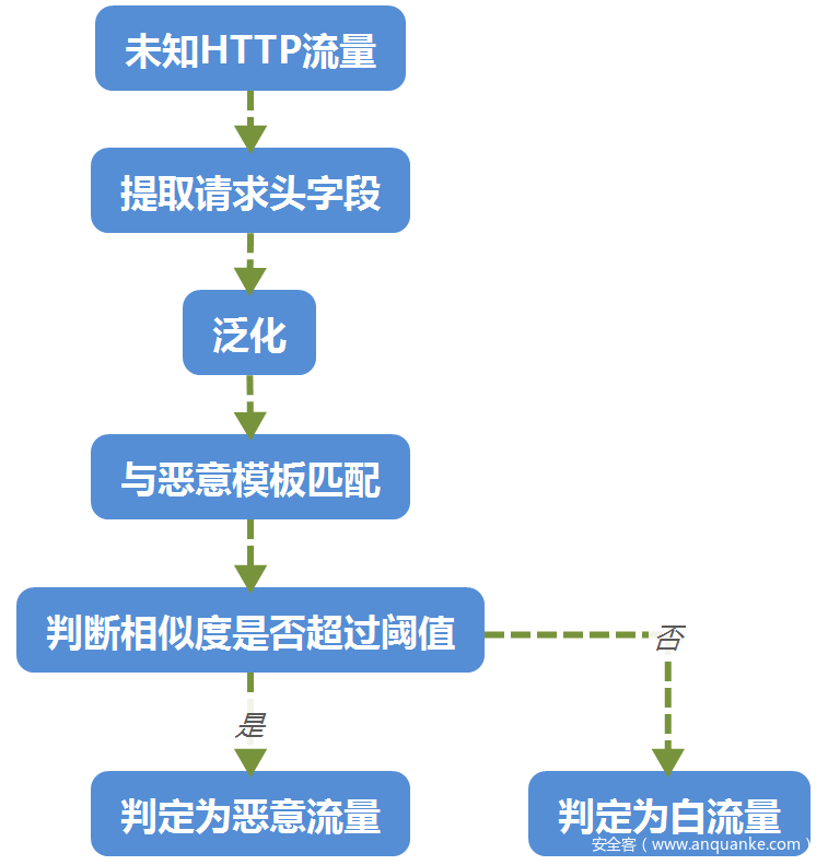 如图4.6所示,模板匹配过程主要包括包括待测流量请求头字段提取,泛化,模板匹配,判别流量性质四个部分。