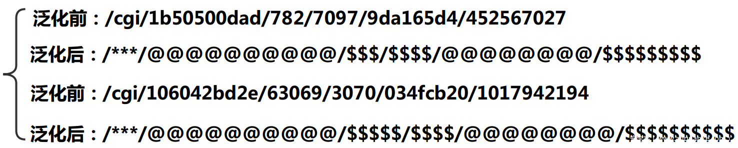 同一家族的恶意流量结构一致,但是有部分具体细节不同。将http流量中的数字部分、字母部分、字母数字混合部分、十六进制部分、base64部分分别用特殊字符替换,取消它们的差异性部分。比如对图3.2中流量的url部分泛化,将字母转换为*,十六进制部分转换为@,数字部分转换为$,泛化后的效果如图4.2,可以看,通过泛化,两个url的结构特征得以保留,而具体内容的差异则被忽略了。