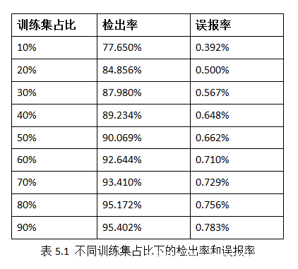 表5.1给出了不同训练集占比下,检出率和误报率的具体数值。可以看到,随着训练集占比的提高,检出率大幅度上升,这是由于算法是建立在模型基础上的。当训练集少时,样本的多样性不足,获取到的模板少,从而检出率较低。随着训练样本的增加,更多的模板特征被获取,检测率也逐渐提高。而误报率随着训练集的扩大而略有上升,这是由于随着模板的增多,白流量匹配到模板的概率也逐渐变大了。但整体误报率的增加并不多,仍在可接受范围。