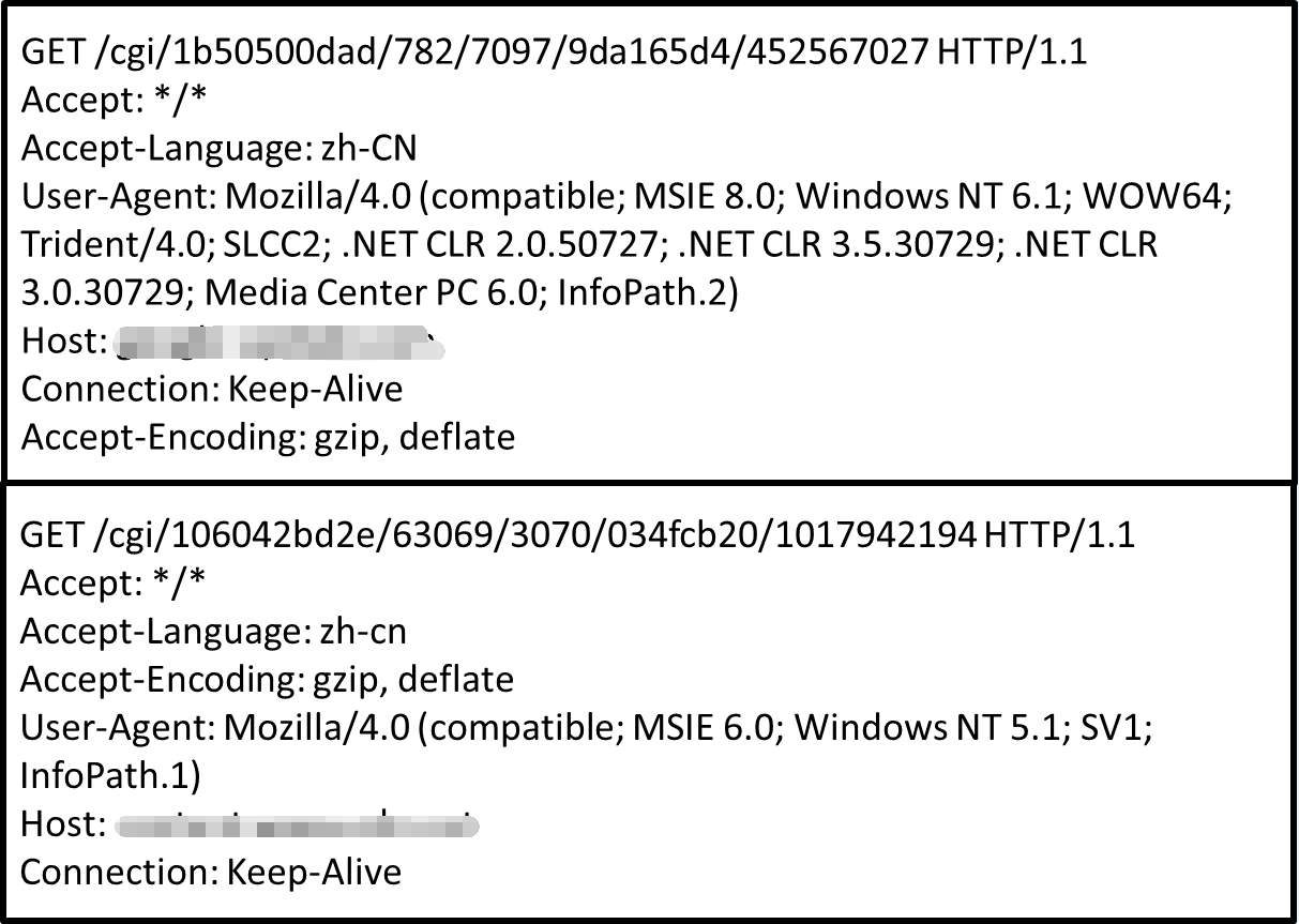 分析同一家族恶意流量,发现同一家族的恶意流量有以下特点①其url路径结构一致,具体路径信息尽管不同,但是都具有相同的数据类型。比如图3.1中url路径中的bugs和job都是字符串,图3.2url中1b50500dad和106042bd2e都是16进制小写类型;②url的参数相似;③请求头字段基本相同,且内容高度重合。