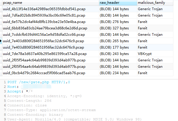 实验室目前积累了大量的恶意样本,部分如图2.1所示。通过在沙箱中运行恶意样本收集产生的外连HTTP流量。这些外连流量中只有部分是恶意的,中间仍掺杂着不少白流量。通过人工分析确认,将产生的外连流量分为恶意流量和白流量。最后利用已积累的威胁情报信息将恶意流量打上恶意家族信息。最终用于训练的数据如图2.2所示。