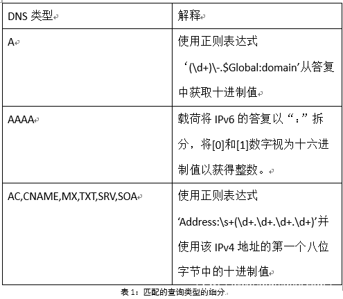 C2服务器将对这些包含在IPv4或IPv6地址中的询问的进行响应,具体取决于载荷用于与其C2服务器进行通信的DNS查询的类型。 载荷将根据不同的DNS询问类型使用特定的正则表达式,如表2所示:
