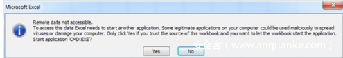 Microsoft Excel打开.iqy文件后使用文件中的URL来获取要包含在电子表格中的远程数据。 默认情况下,Excel不允许从远程服务器下载数据,会通过显示对话框询问用户的同意: