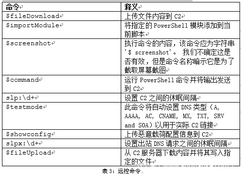 这些正则表达式用于构建字符串,然后载荷将受其命令处理程序的指派进行操作。 我们分析了有效负载以确定可用的命令,这些命令提供了各种远程控制的功能。命令字符串如表3所示:
