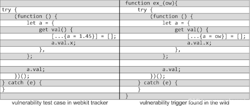 此漏洞利用的目标是CVE-2017-2505,最初由lokihardt报告为Project Zero issue 1137,并于2017年3月11日在WebKit HEAD中通过提交4a23c92e6883修复。该修复程序随后于5月15日发布给iOS 10.3.2用户。有趣的是,漏洞利用exp几乎与WebKit存储库中的漏洞报告和测试文件完全相同。可以在下图中看到,左边的图像显示在WebKit代码存储库中发布的测试用例,右边显示了触发漏洞的在野漏洞利用代码的一部分。
