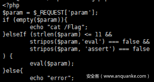 Flag.php 是一个简单命令执行绕过,限制使用eval、assert函数和长度不得超过11位,满足以上两个条件进入eval函数执行