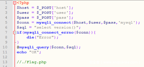 发现连接地址、用户名、密码参数可控,看来考点是mysql伪造恶意服务端读取客户端文件,按照泄露的源码来看,应该是要读 /Flag.php 文件