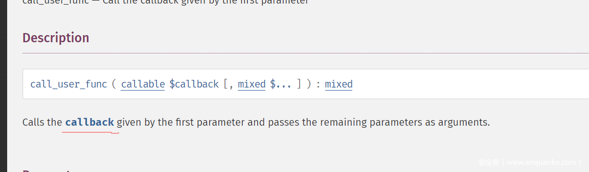 首先来个常见的可利用的回调函数,call_user_func,看下英文解释找到其中的特征