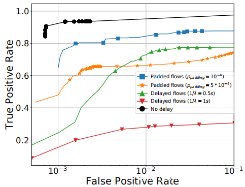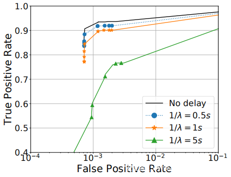 下图显示了针对不同λ值的基于事件的检测器的ROC曲线。注意λ定义了添加到数据包的平均延迟量。增加增加的延迟(通过减小λ)会降低攻击的性能,因为它会导致在受监视的流中使事件未对齐。例如,1λ= 1s将攻击者的TP从93%降低到86%(对于恒定的10 ^(-3)误报)。