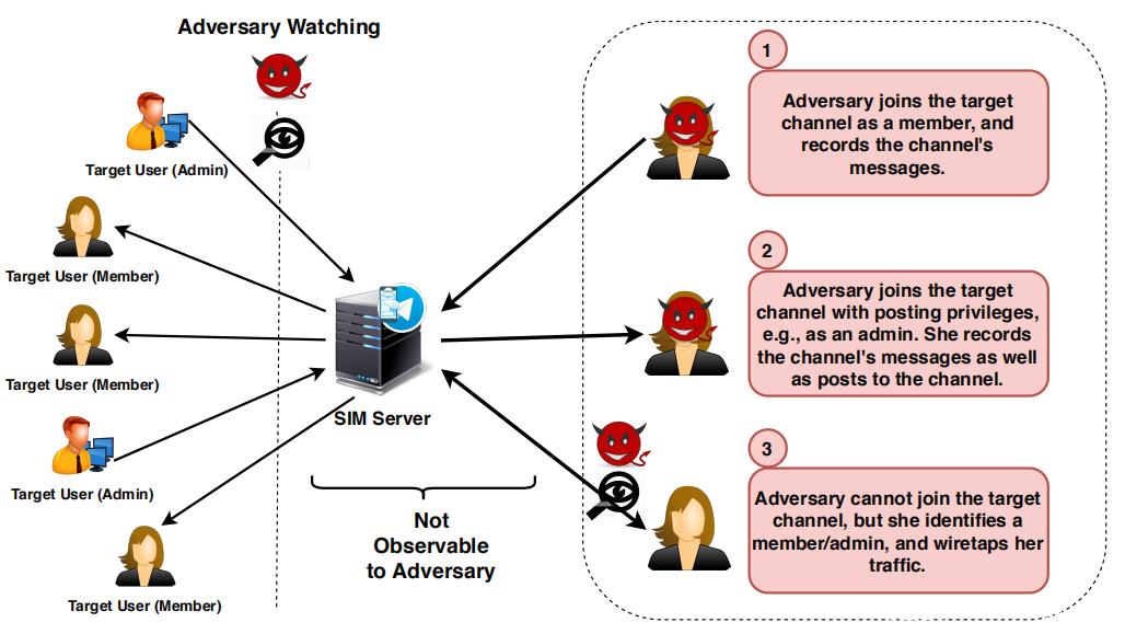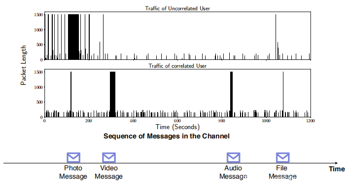 目标客户端可能是目标频道C的成员,也可能不是该目标频道的管理员。攻击者无法看到目标客户端通信的内容(由于加密),但是她可以捕获目标客户端的加密流量。然后,对攻击者使用检测算法来确定目标用户是否与目标频道C相关联。