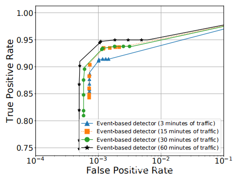 请注意基于事件的检测器,对于短暂的流量观察(例如15分钟),无法在ROC曲线中观察到小的FP。这是因为基于事件的相关性使用了匹配事件的数量,由于在短时间间隔(例如15分钟)内事件数量有限,因此非常粗粒度。使用分析上限来估计较小假阳性值的性能趋势。