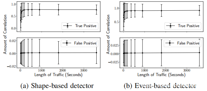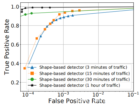 比较两次攻击:上图分别显示了基于事件的检测器和基于形状的检测器在使用ROC曲线(针对4种不同的观察长度)的不同检测阈值下的性能。可以看到,正如预期的那样,更长的流量观察可以提高两个检测器的准确性。例如,基于形状的检测器提供TP = .94且FP = 10^(-3),观察时间为15分钟,而一个小时的观察将FP减小到接近FP = 5×10^(-5)。