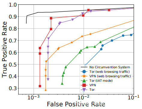 使用常规的Tor(无附加混淆)以及使用VPN都无法显着抵抗攻击,例如,通过这些服务进行隧道传输时,获得的TP为85%,FP为5×10(-3)(使用15分钟的流量)。但是,在通过Tor和VPN进行隧道传输时增加后台流量会降低攻击的准确性,但是使用Tor的obfs4模糊处理工具,可以获得最佳的对策性能。请注意,由于此类系统的较差的连接性能,通过诸如Tor的通用规避系统进行隧道并不是最吸引用户的对策。