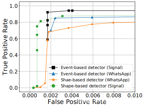 上图显示了使用15分钟流量的Signal和WhatsApp应用程序中基于事件和基于形状的检测器的性能,展示了与Telegram相当的检测性能。特别是,类似于Telegram,对于较小的误报率,基于形状的检测器具有更好的性能,而对于较大的误报率,基于事件的检测器可实现更高的准确性。结果表明,由于流量模式的相似性,攻击普遍适用于Telegram以外的SIM卡,这是由于这些服务未使用任何混淆机制。