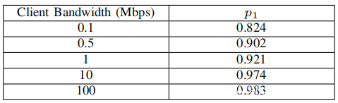 当H1为真时,f(U)的每个事件的延迟版本也会出现在f(C)中,目标用户的带宽会影响突发提取过程。如本节前面所述,为IMD小于te的消息合并数据包突发。因此,假设用户发送消息所花费的时间足够长,以使当前消息和下一条消息之间的IMD小于te。因此,这两个连续的消息被组合在一个突发中。下表显示了从数据中观察到的不同带宽下的p1值。由于实验的带宽为1Mbps,因此p1 = 0.921。