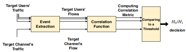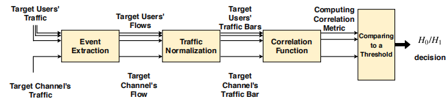 设计了两种算法来执行攻击(即,将受监视的IM用户映射到他们的频道),场景实际上与流相关攻击的场景最接近。因此,攻击设计受到流相关性现有工作的启发。先前的流量相关技术使用标准统计度量,例如共同信息(mutual information)[1],[2],Pearson相关[3],[4],余弦相似度[5],[6]和Spearman相关[7],链路网络流通过关联它们的数据包时间和大小向量来实现。使用假设检验以针对IM通信的特定设置设计最佳流量分析算法,与使用网络数据包功能的流量相关研究相反,使用IM消息的特征(时间和大小)进行检测。