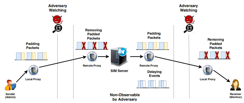 设计并实现了一个专门为IM通信而构建的基于代理的混淆系统,称为IMProxy。IMProxy结合了两种混淆技术:更改事件的时间(通过添加延迟),以及通过添加虚拟流量来更改事件的大小。 IM客户端能够启用这些对策中的每一个,并指定混淆的幅度,以使其在性能和弹性之间进行所需的权衡。 IMProxy不需要IM提供商的任何合作,可用于混淆任何IM服务。